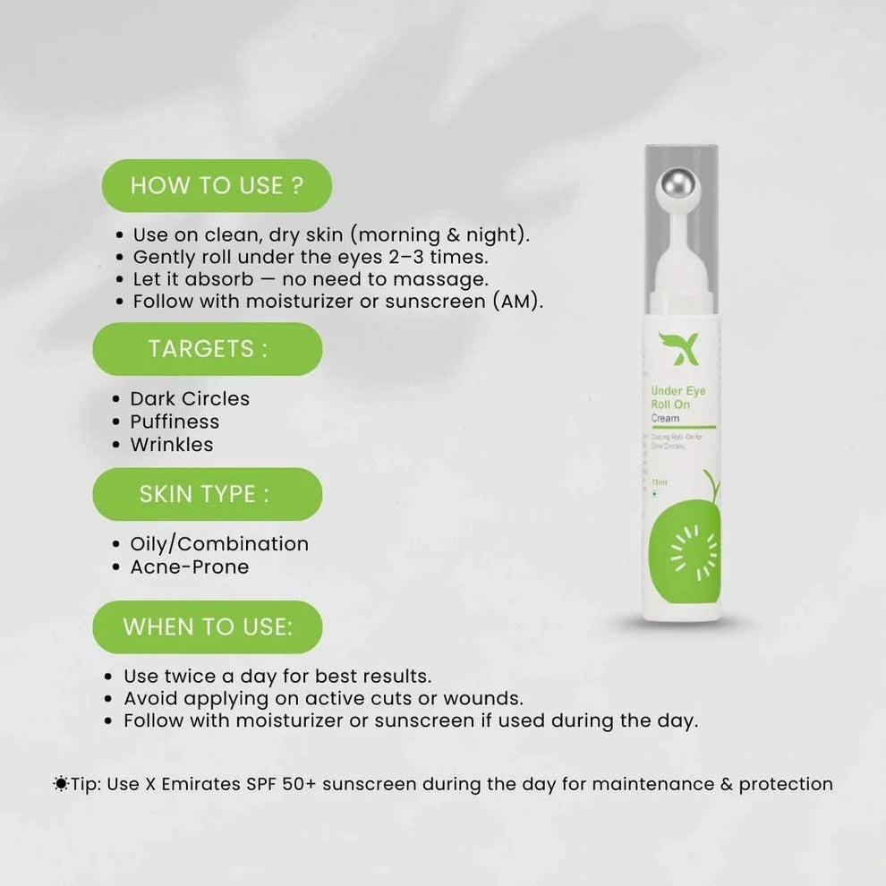 Wake up tired eyes with the power of advanced skin science. Xemirates Under Eye Roll-On is specially formulated to reduce dark circles, puffiness, and fine lines while delivering a cooling, soothing sensation with every glide.